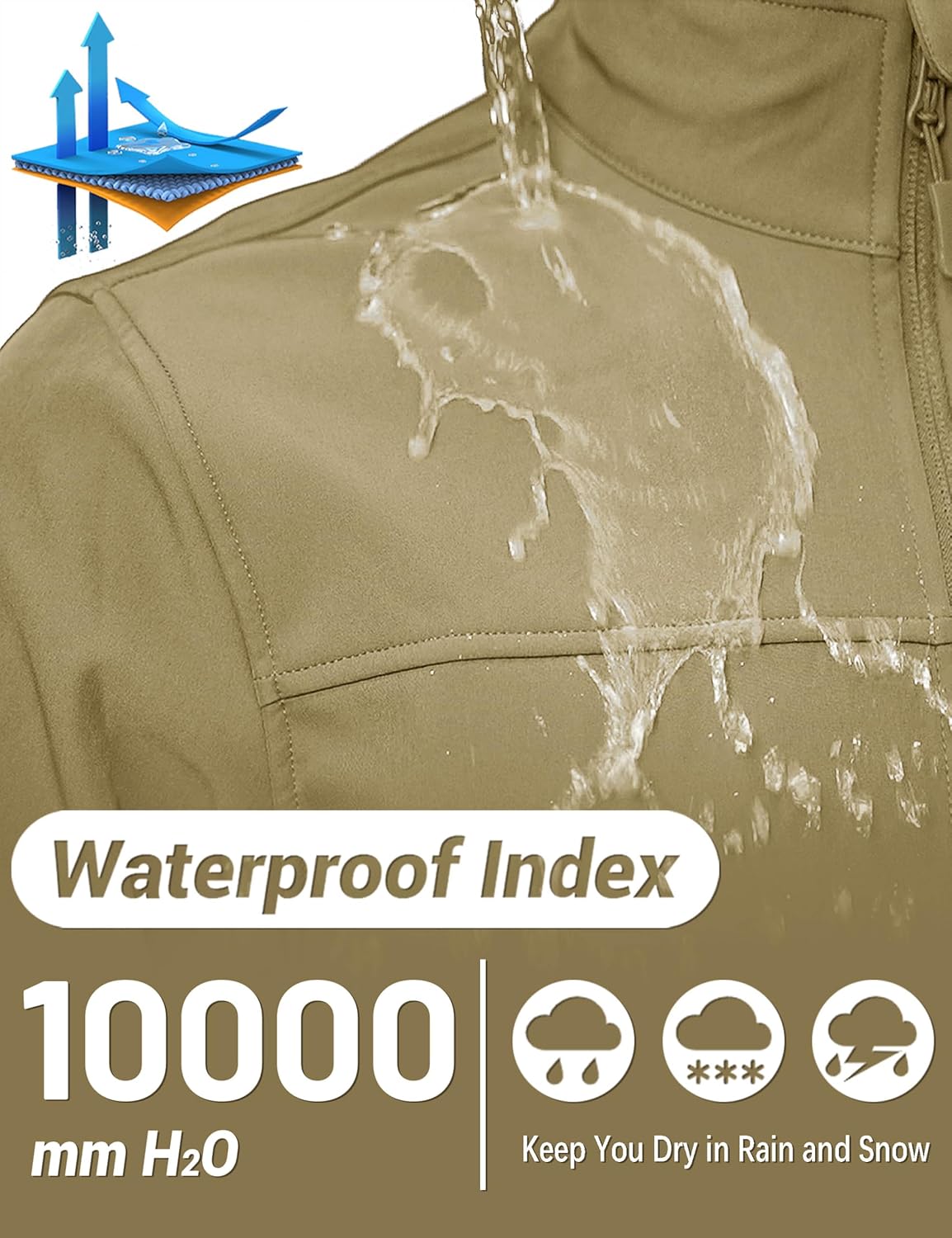 - Waterproof & Breathable—— mens softshell jacket features a high-performance waterproof fabric (10,000mm rating) and a breathable lining (5,000g/m²/24hr) to block rain while keeping you dry and comfortable.